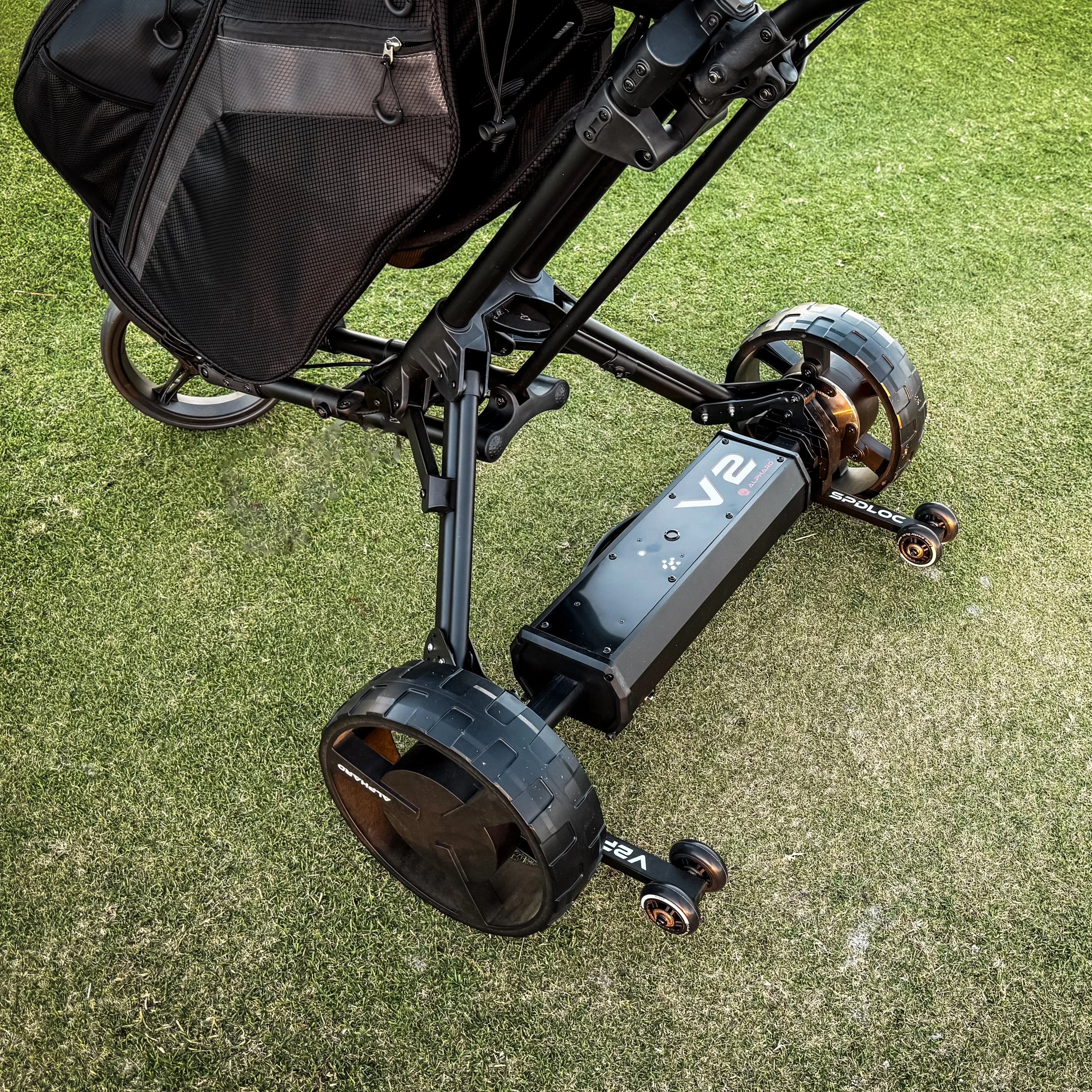V2Pro er fjarstýrður rafmagnsmótor sem festist á þína Clicgear kerru. Þú gengur og kerran rúllar með.